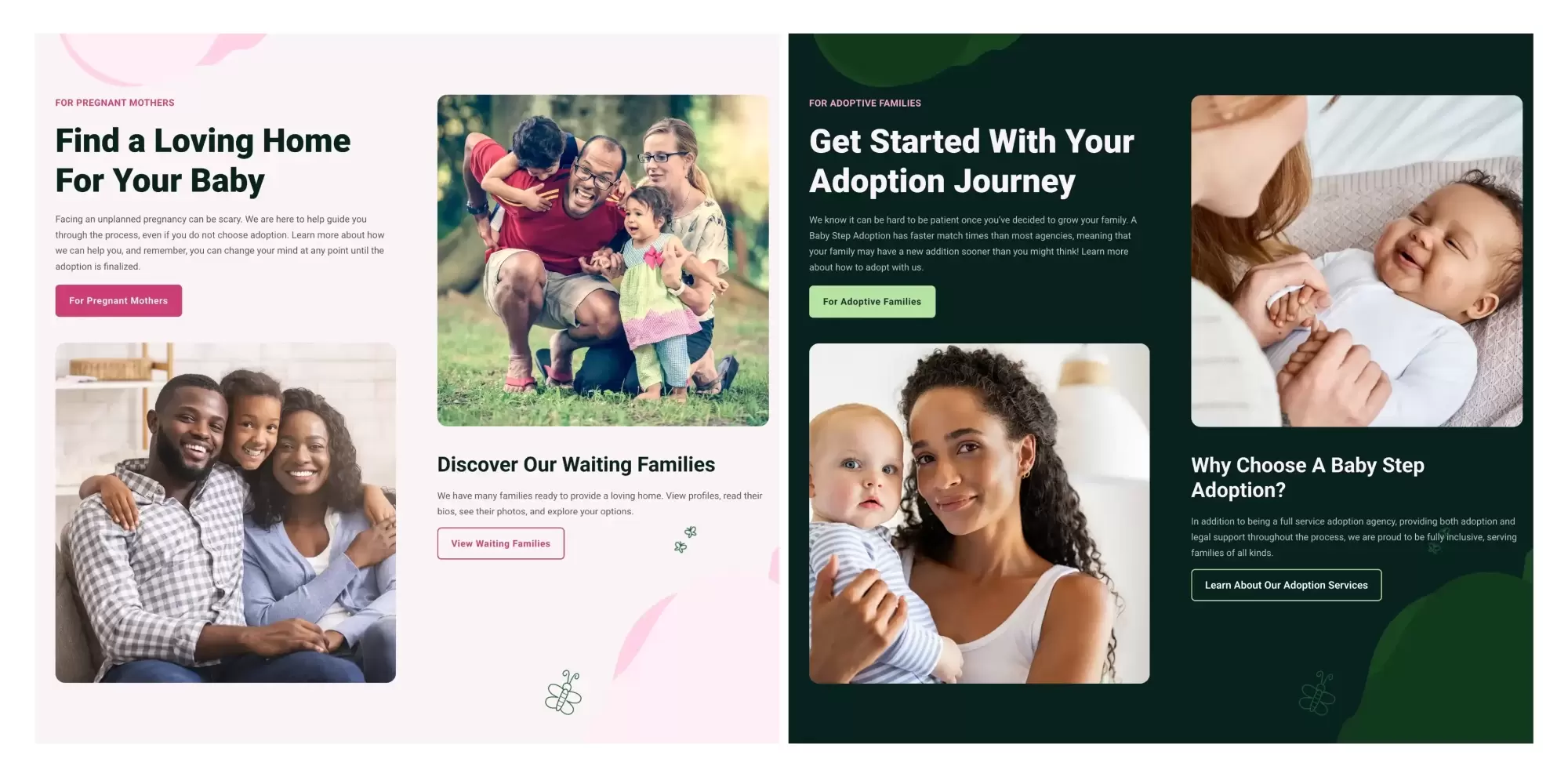 They didn’t want to blend in, they wanted to own their niche. We built on a warm, modern WordPress template, enhancing it with delightful custom butterflies and flowers that gave the site its own personality and charm. We selected stock photography that reflects the diverse nature of their client base, moving beyond typical adoption agency imagery to emphasize inclusivity and modern family structures.